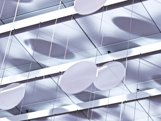 airFIELD, by Jamie Barlow, Dan Goods and Nik Hafermaas uses simple LCD discs in a clean waveform to create a visual representation of the traffic in and out of Atlanta’s airport. It reminds me of both the Kinetic Rain Installation and the Patterned by Nature installation, but the use of white as the LCD color instead of black gives it a light and airy feeling.