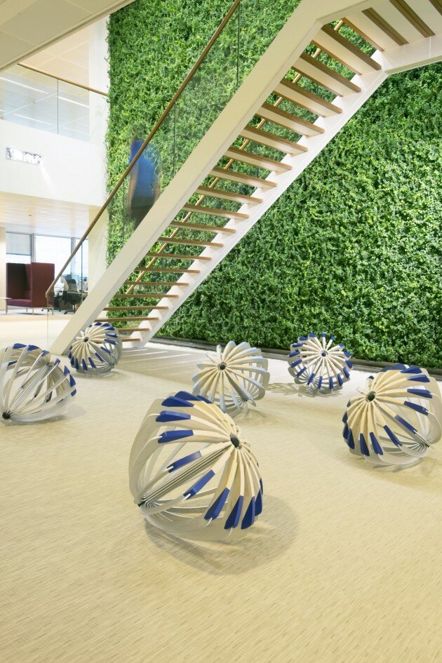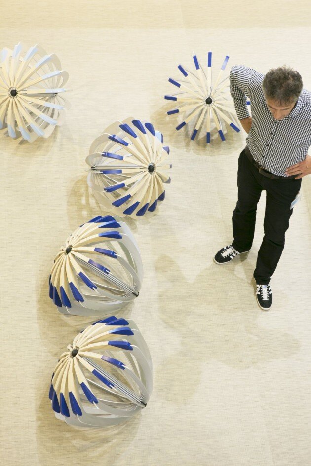 Made from aluminum strips, designer Carmela Bogman has created Tumble Weed, a stool that requires the user to sit down in order to get the stool into position. The way the stool then seeks its own level when not being used creates an organic, random and ever-changing look to a seating area.