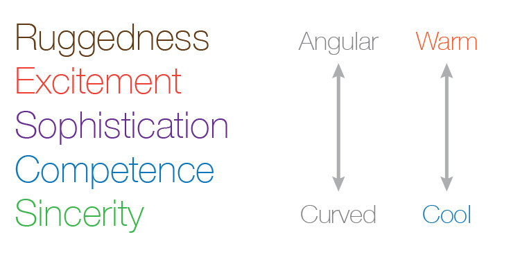 Finally, we must keep in mind that there are only five main brand categories and that colors, forms, fonts, and written copy for those different categories also vary from warm, earthy and angular (Rugged and Excitement) to cool, curved and friendly (Sincerity and Competence). Next time you are in a client meeting discussing likes and dislikes, be sure to frame the conversation to avoid personal preference and stick to the brand personality.