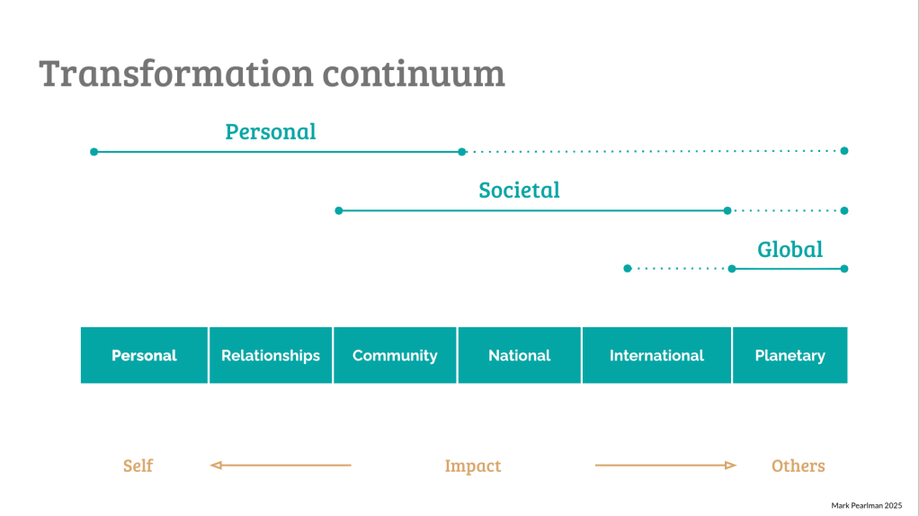 At the personal level, transformation is about the self. Healing, belonging, calmness, caring, whatever “better” means to each of us. The mundane grocery store aisles, of all places, sit right in the middle of the three levels of transformation.
