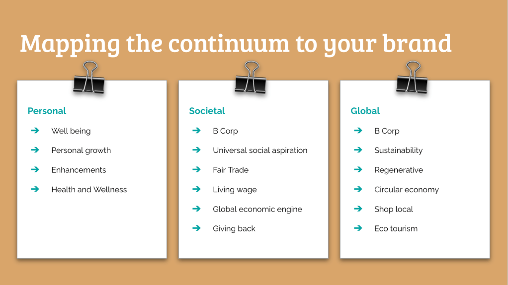Thought starter: Stepping back from the grocery store one more time, any brand can support global transformation. The consumers’ goal of being a good steward for our planet helps them fulfill their desires. What can your brand do from a global perspective to support your customer’s desire to do no harm and leave no trace?