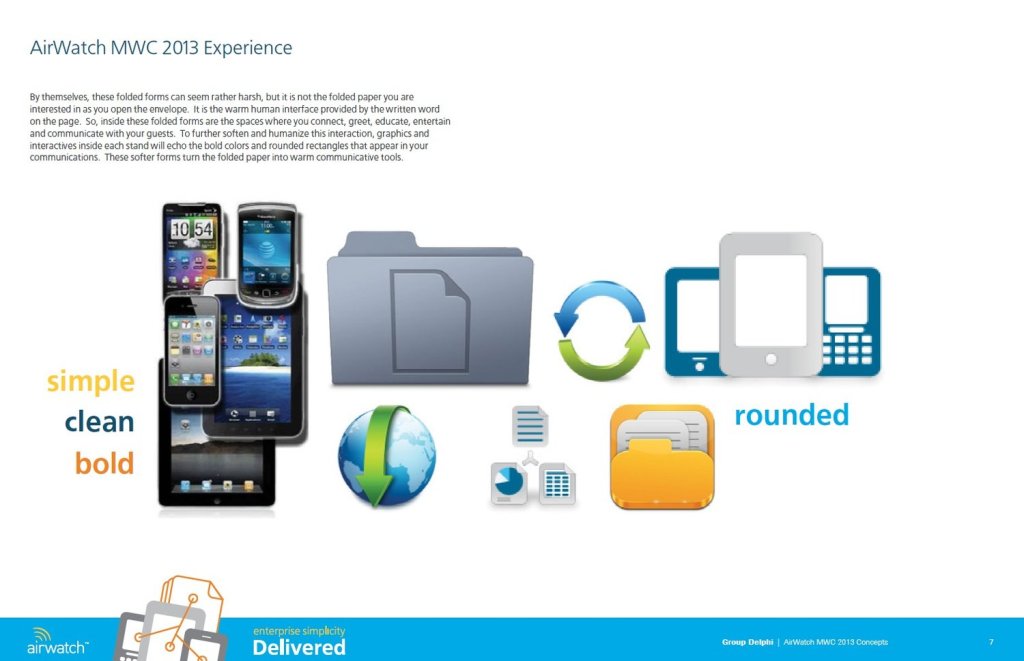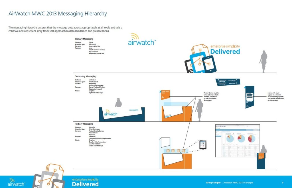 At Mobile World Congress, Airwatch had multiple exhibition spaces and was making their premiere at the congress. The challenge was to create a visual language that would immediately identify Airwatch as a leader in the secure mobile device document management space.