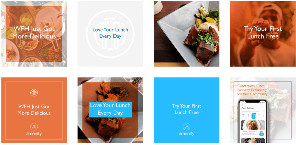 Social media assets were developed as plug and play elements for email marketing, Facebook, and Instagram. The campaign used a food and user forward look layered with call to action statements. The alternating color palette from warm (representing homemade meals) to cool (representing how Amenify simplifies apartment living) gave the social media carousels more punch and contrast to attract the viewer. Over 50 social media assets were developed to allow for the campaign to remain fresh over time.