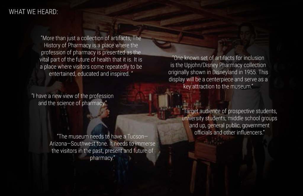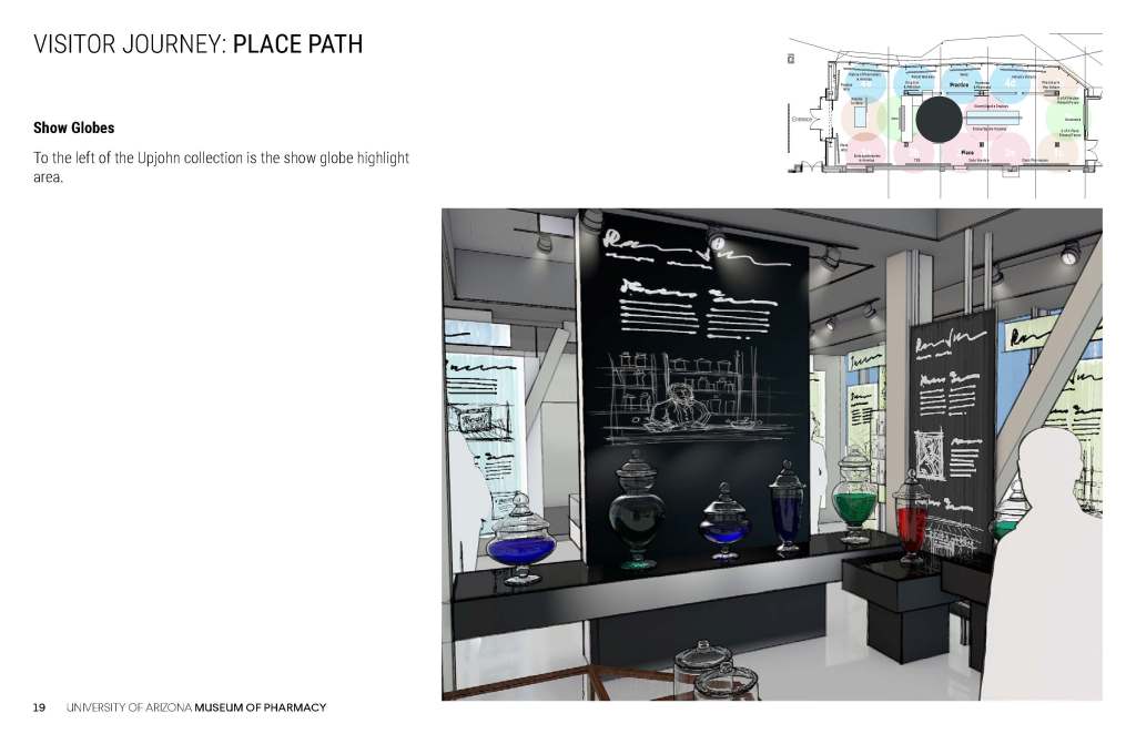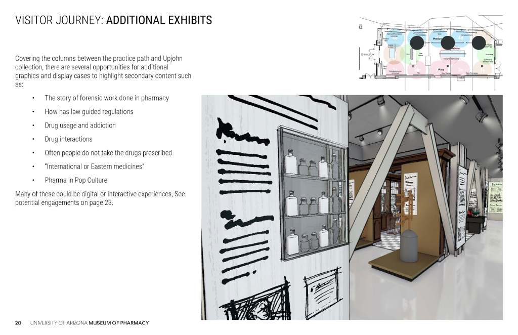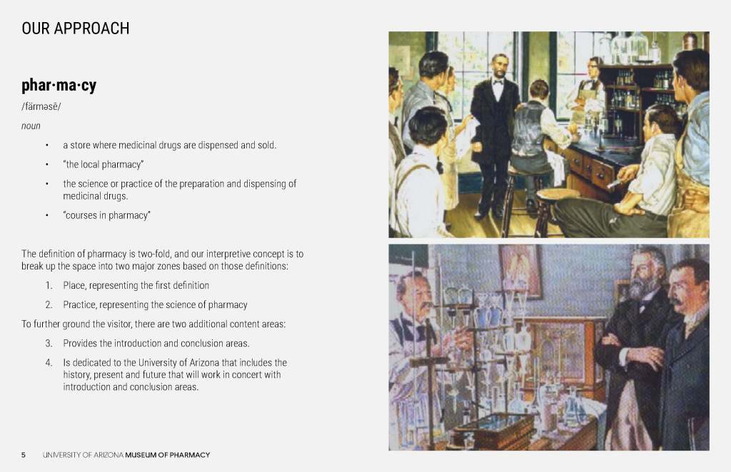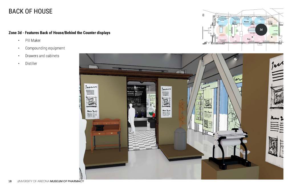 These concepts for the Coit Museum of Pharmacy were developed in conjunction with the University of Arizona Department of Pharmacy, the major donor, and the content producer who would develop the museum digital content.