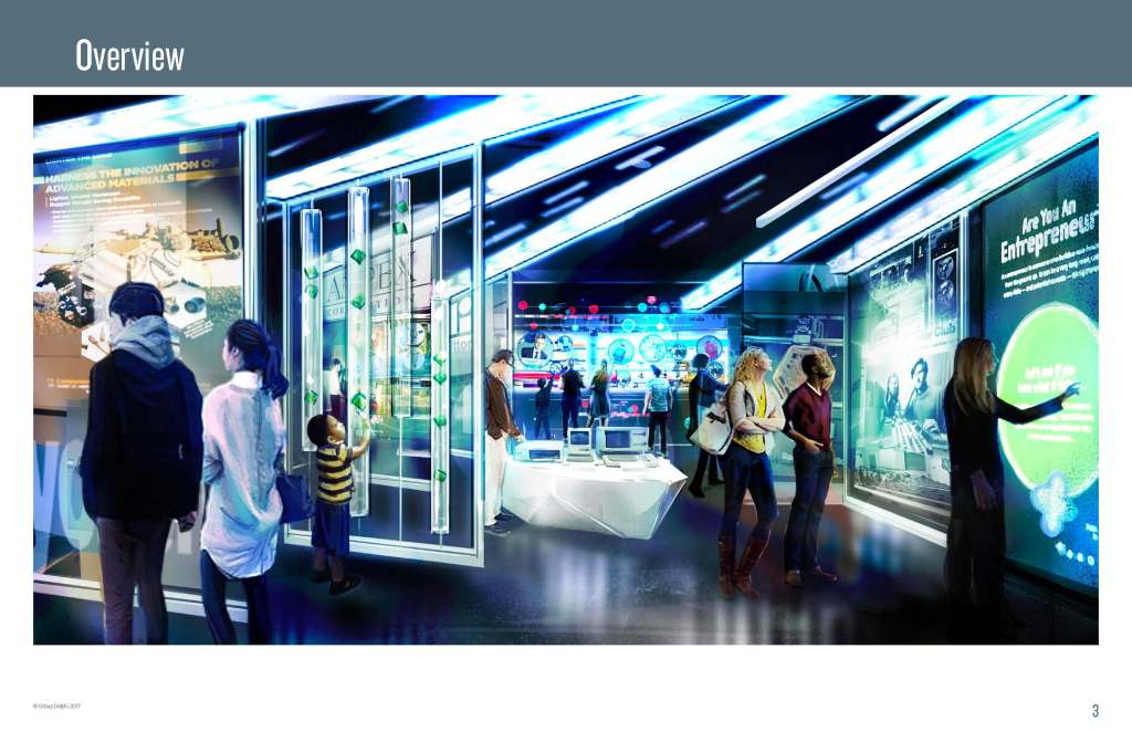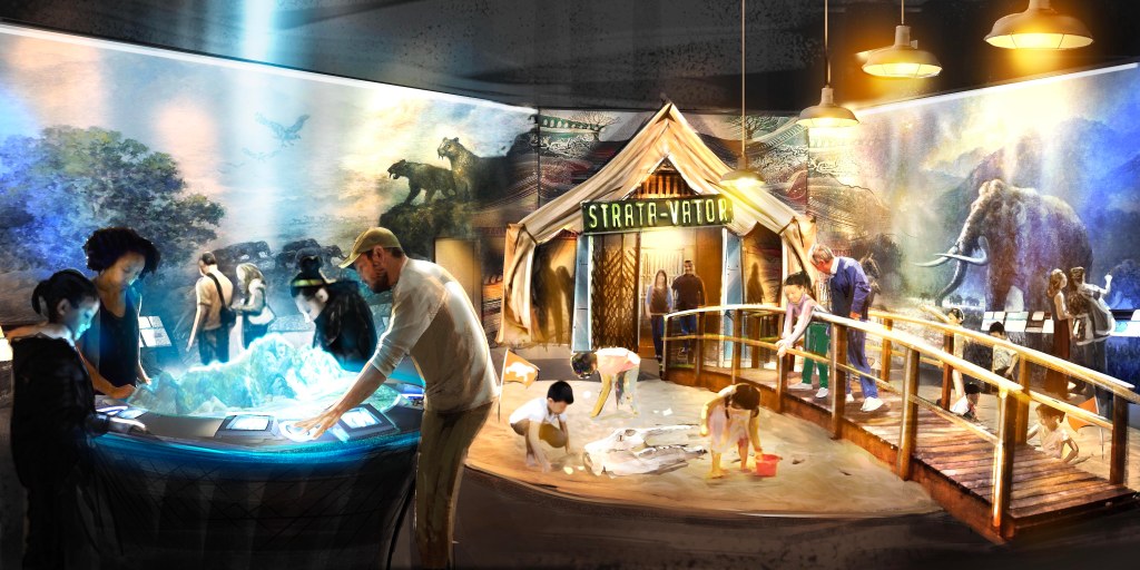 The first gallery was to highlight the most complete dinosaur skeleton of the amphibious Neoparadoxia repenningi which was discovered in San Mateo County. The gallery would use a video, sound, and shake simulator experience to simulate a Stratvator that would take visitors back in time and deep down into the strata of the dig site. Once guests emerged from the Stratavator, there was a simulated dig site and underwater diorama that held the skeleton.