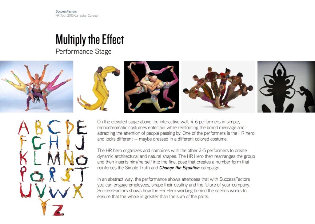 For HR Tech 2016 I created a live performance based around SAP SuccessFactors‘ Simple Truths campaign that was specifically targeted to the HR Tech audience and the HR cloud based SuccessFactors software. Custom media, graphics, lighting and scripting was used to create a coordinated messaging platform that drove guests to the space. Check out the press in Event Marketer and via the award links below.