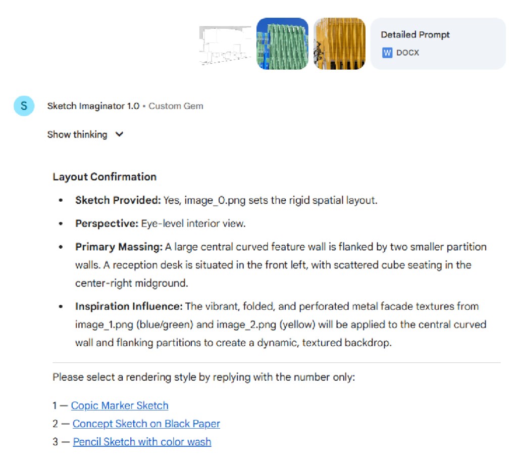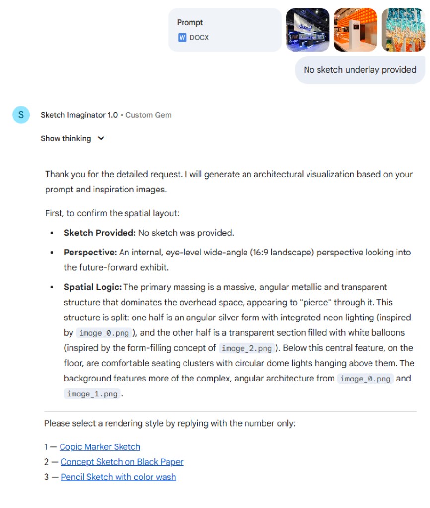 The Google Gem sets limits and priorities between the different image types in order to assure that the sketch underlay takes compositional and massing preference over the prompt language and inspirational images.
