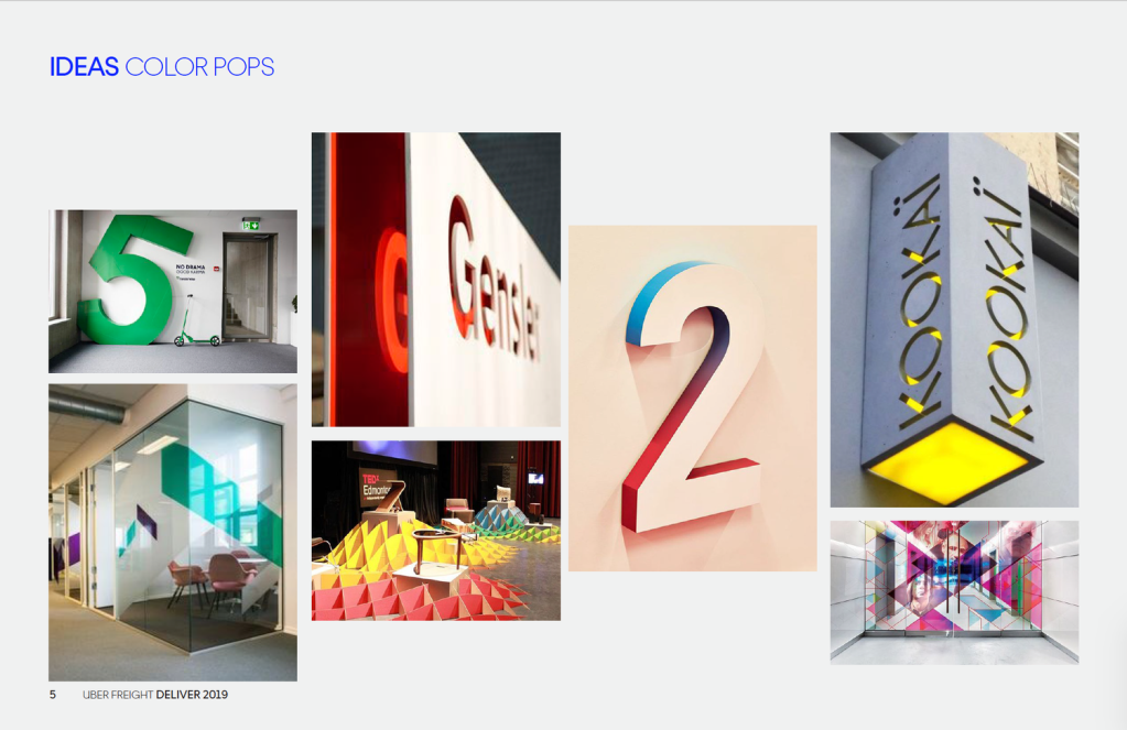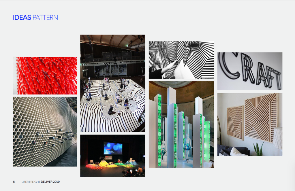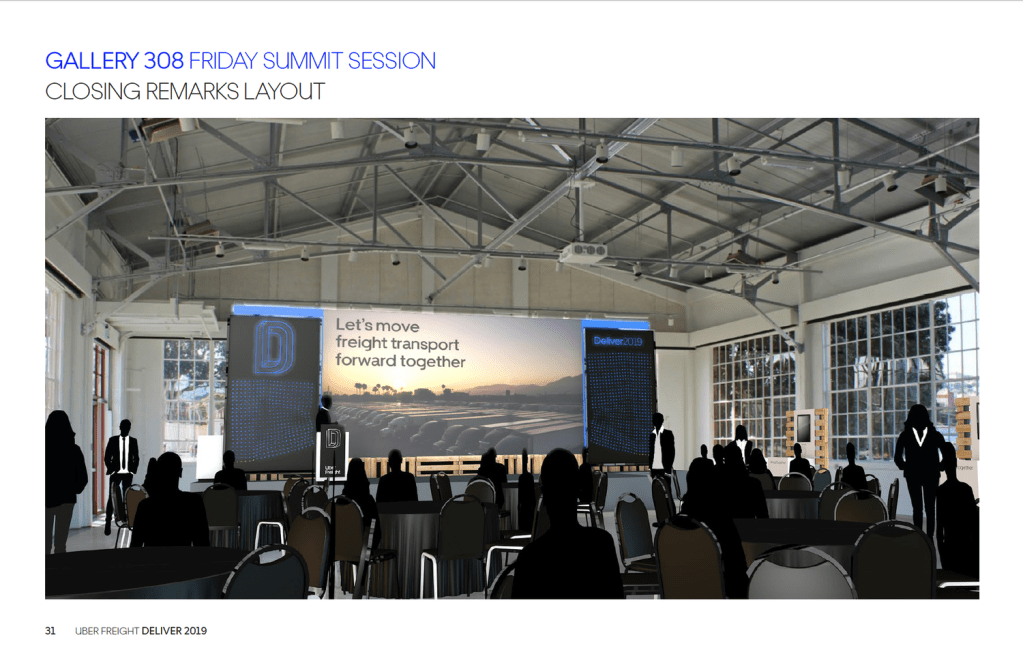 The concept leveraged visual metaphors for movement, via media segues, and architectural forms, that would echo this idea of movement and encourage attendees to propel their businesses forward by moving into the future state of freight transport with Uber Freight. The highlight was an LED stage backdrop that had laser perforated mobile panels that allowed the stage to move and change throughout the day. The sliding panels would be cut with an event logo and a flowing pattern to represent the theme. When placed in front of the LED screen, the pierce cut section will glow from behind. The movement of the LED content gently flowing and color changing will shine through the pierced pattern and bring another level of movement to the stage.