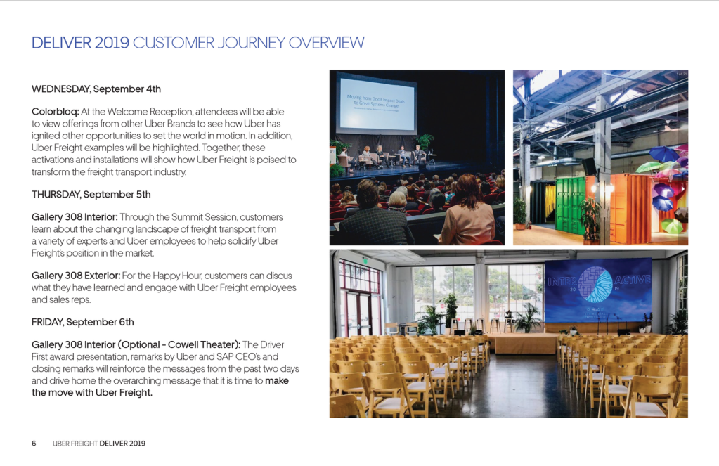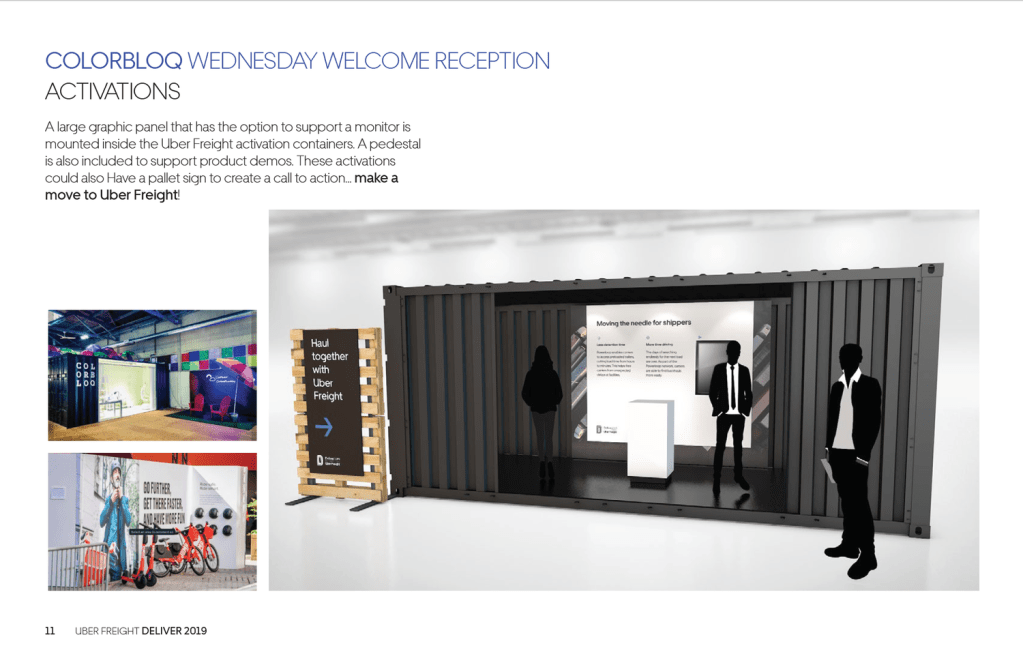 Leading into RFP season, Uber Freight’s key objective was to land more enterprise scale shipping clients. To educate and attract RFPs, Uber Freight planned to host will an invite-only summit for its top 100 customers to Increase RFP win rates and share 2020+ vision and build credibility. The concept aimed to provide a visual and structural platform that encourages potential and existing customers to make the move with Uber Freight. The statement resonates with the audience in several ways. For the attendees, it influences them to consider moving from a fragmented freight market to a digitally activated network that provides scale and reliability. Secondarily, this idea echoes the processes of transporting or moving freight.